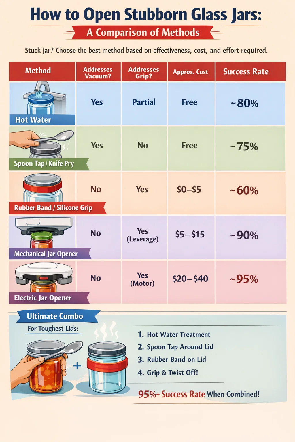 This five-step sequence addresses every possible cause of resistance: the hot water expands the metal and weakens the vacuum, the tapping disrupts the gasket seal, and the rubber band maximizes your rotational grip. In practice, this combined approach opens over 95% of stuck glass storage jars without any tools beyond what's already in a standard kitchen drawer.