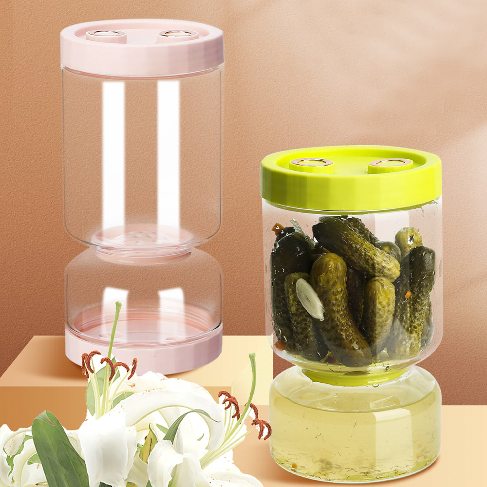 The pickling container features a clever dual-layer design that effectively separates wet and dry components. With a simple flip of the jar, the pickle juice swiftly drains to the bottom. Bid farewell to soggy pickle liquid that could otherwise dampen your sandwiches. It's an ideal choice for pickling olives, cucumbers, jalapenos, or pickle slices.